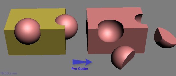 Pro cutter kullanılırken parçalardan biri(Küre) seçilerek başlanır ve Cutter parçalayıcı nesneler Pick Cutters seçeneği ile işaretlenir. Daha sonra Pick Stock object seçeneği ile parçalanacak cisim(Kutu) seçilir. İşlem sonrasında Stock inside cutter seçeneği işaretlenirse şekildeki gibi kesişme alanları yeni Element olarak belirlenir.