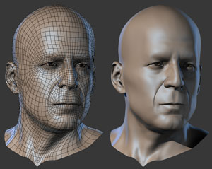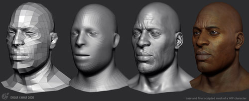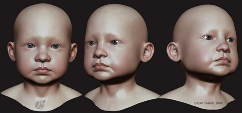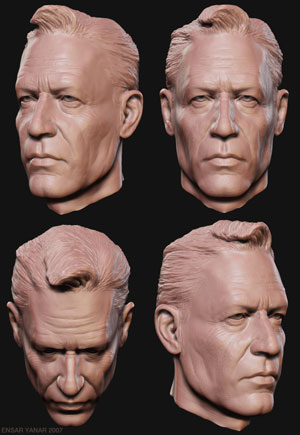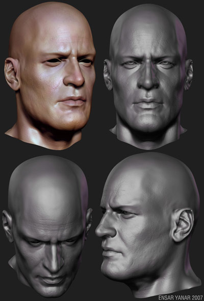 Konsept çizimler ve özel çekilmiş resimler hariç neredeyse hiç kimsenin tam önden ve profilden resimlerini bulmanın pek mümkün olmadığını düşünülünce, arkaplana resim koyarak çalışmayi tercih etmiyorum. Bir tarafta referans resmi açıp bakarak çalışmak bana daha pratik geliyor. Ayrıca bunun hem anatomik bilgimi hem de gözlem kabiliyetimi arttırdığını düşünüyorum. Karakter modellerimde genelde önce düzgün topolojiye sahip kaba modeli 3d programımdaki poligon modelleme araçlarıyla modelliyorum. Sonrasında her türlü oranlamayı ve ince işçiliği Zbrush ve Mudbox’ta yapıyorum. Her zaman ikisini birden kullanmasam da, detayları Zbrush’ta vermeyi, orantı ve benzerlik içinse Mudbox’ı kullanmayı tercih ediyorum.