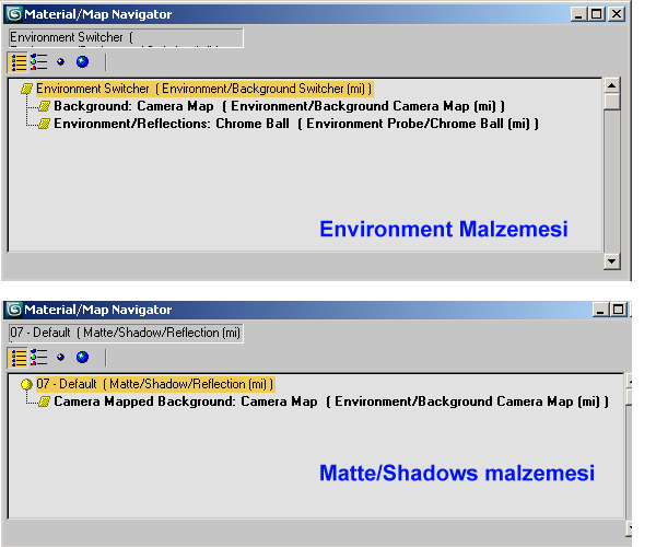 Sistemin mantığı: çevresel Arkaplan için Mental ray environment switcher materyalleri ve Plane için yine Mental ray´a ait olan Matte shadow malzemesi kullanılıyor.