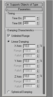 Tekrar space warps menüsü altındaki force dan bir drag ekleyelim...Bunun pozisyonu önemli değil winddeki gibi.. 0 ve 400 . frame i gücü bu aralıkda kullansın diye tercih ettim. Linear damping ayarlarini 10 yapmamın sebebi x y ve z yönlerinde aynı etkiyi vermesi için.