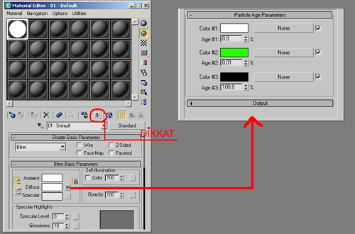 Particle Flow araçlarından spawn kullanımı ve materyal uygulama işlemi