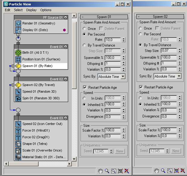 (spawn kelime olarak yavrulamak anlamına geliyor...yani yaptığınız particle miktarı dışında olan yavruların miktarlarını ayarlamak üzere tasarlanmıştır..buradaki parametrelerle ugraşarak degişik görseller elde edebilirsiniz.. Per second da kelime itibari ile her saniye demek oldugundan, her saniye eklenecek parçacık sayısını belirlemiş oluyoruz..(Bu sekilde yazarak anlatmak uygulamaktan çok daha zor , anlamsız bir açıklama olmuşsa kusura bakmayın)