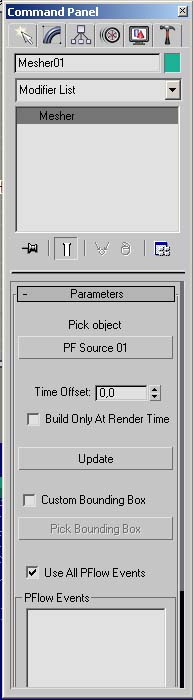 (Mesher herhangi bir parçacık sistemini Mesh olarak dönüştürüyor. bu sayede normal taneciğe uygulanamayan tüm modifierler taneciklere etki edebiliyor. Patlamalarda kırılmalarda yanmalarda bunu kullanıyorum nedeni pflowu uvw map kaplayamıyorsunuz ama mesher bütün pflowunuzun bilgisini taşıdığı ve tek parça olduğu için kaplamalarda bir sorun olmuyor..bütün eventlerı gruplamış gibi düşünebilirsiniz)