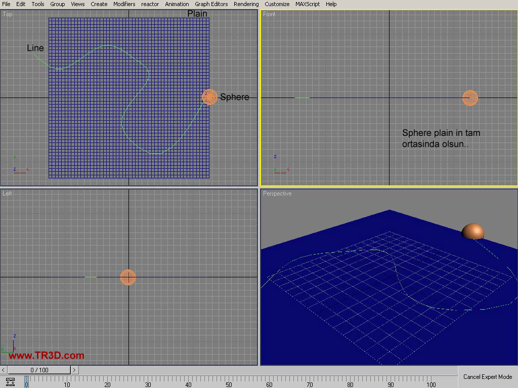 Animasyonu test amaçlı deneyince sphere in peşinde (eğer position objeyi pivot yapmayı unutmadıysanız) line üzerinde hareketsiz parçacıklar oluşması gerek...Buda işimizin bu aşamaya kadar doğru geldiğini gösterecek :))