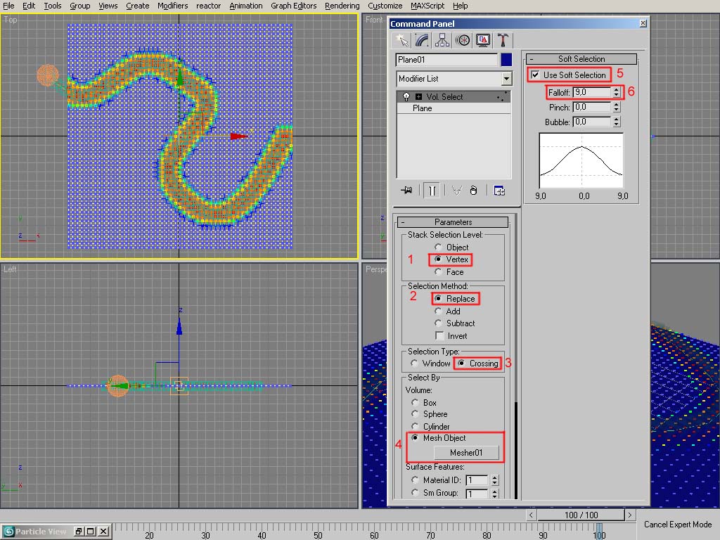 bütün ayarları kırmızı ile sırası ile resimde anlattım.. Select bydan mesh object i seçin none yazan butona tıklayıp mesher i seçin..Soft selectionu işaretleyin falloff 20 birim siz bir bakın oluşacak renkli yol izine bana 9 birim uygun geldi size uygun geleni siz ayarlayın...sonuçta oluşacak görüntünüzün yumuşatmak maksatlı bir parametre soft selection...kafanıza göre :)))
