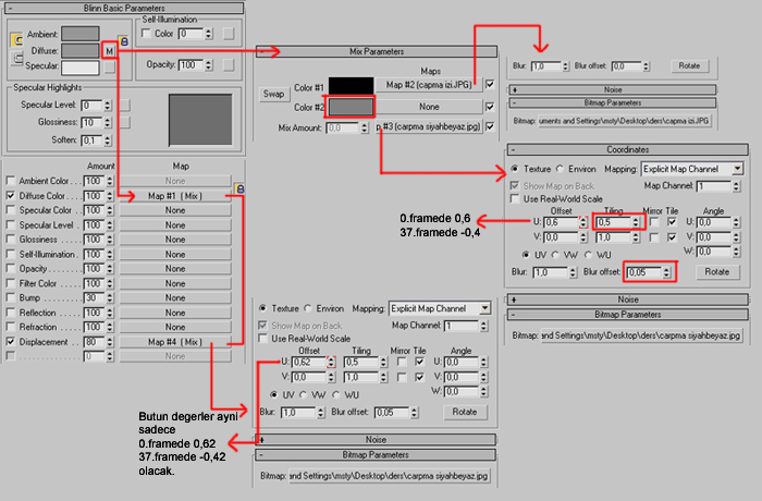 Şimdi gelelim zemin için yapacağımız materyal ayarlarına....boş bir slot seçin ve diffuse ye mix ekleyin..color 1 e hazırladığım çarpma izi isimli kaplamayı ekliyorum..color 2 yi gri yapalım(beyaz olan rengi 128,128,128 ile gri yapın . Nedeni yaptığımız çarpma izi kaplamasının genel rengine eşitlemek...Mix amounta de çarpma siyah beyazı ekledim..