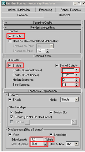 mental rayi seçtikten sonra renderer / rendering algorithms menüsünün altındaki scanline kısmını enable edin.