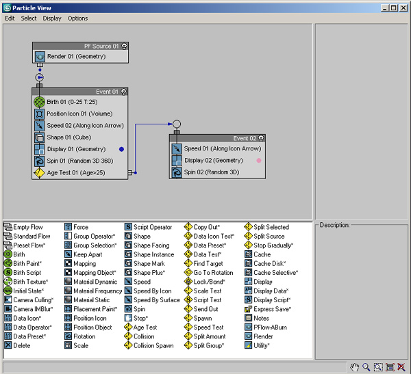(bunu modifier menüsünden standart primitive/particle system/particle flow´u seçip ekrana yerleştirerek yapabilirsiniz..Ama o şekilde yapılınca koordinat ve ebatlar sizin hakimiyetinizde olacaktır...2.yolda üstteki menülerden graph editors den particle view´i açıp açılan kısıma sağ tıklayarak standart veya empty flowu seçerek yapabilirsiniz..Bu şekilde yapılıncada tam 0,0,0 koordinatlarına ve 10*20*20 ebatlarında çıkar..Belirli bir alan kullanılacaksa daha kullanışlı bir yöntemdir..)