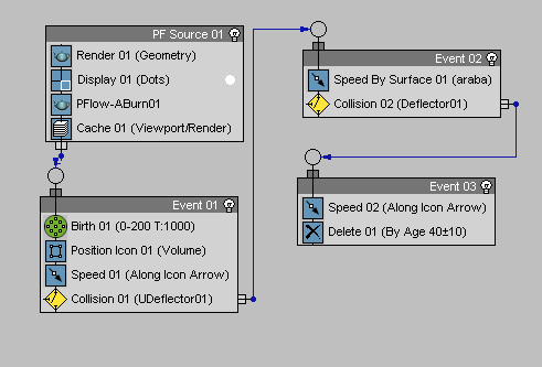 Şimdi oynatın.. Speed by surface nedeniyle arabanın üzerindeki girintiler doğrultusunda giden parçacıklar arabanın arkasındaki deflectore gelince ona çarpıp geri dönüyorlar.Eğer bu arabanın arkasındaki deflector u kullanmasaydık Speed by surface nedeni ile bütün parçacıklar arabanın etrafında dolanıp dururlardı..ama collisionla arkadaki deflector u pflowa tanıtınca yeni bir eventta hareketi kontrol etme şansımız oluşuyor...
