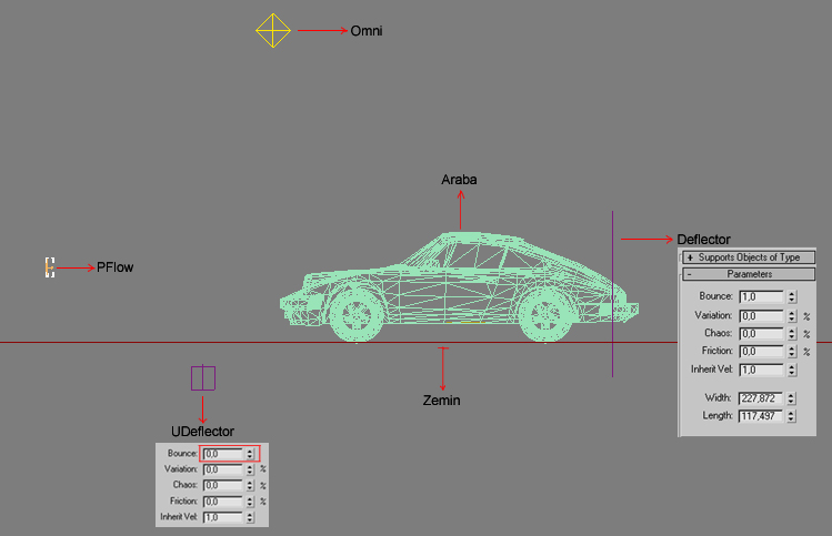 Araba eğimli bir yüzey olduğu için Udeflectoru seçeceğiz...Sahnenizin herhangi bir yerine koyun..Udeflector ün özelliklerinden etkileyeceği objeyi seçebileceğimiz için koyduğumuz yer önemli değil.. Yerleştirdikten sonra parametrelerine gelip pick object butonuna basıp arabanızı seçin...Böylece pflow event aşamasına geldiğimizde bu Udeflector sayesinde objemizi(arabayı) Pflowa tanıtabileceğiz.. Bounce ayarınıda 0 yapınki parçacıklar arabaya çarpıp istemediğimiz yönlere sekmesinler..