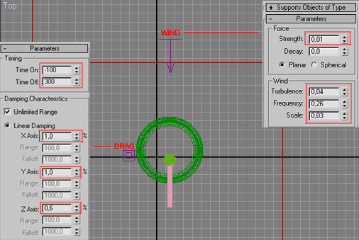 Hareket vereceğimiz yönü seçerek bir tane wind koyalım..Sonrada bir tane drag yerleştirin herhangi bir yere..ayarlarını resimde verdim..Benim kullandığım yönüde buradan görebilirsiniz..