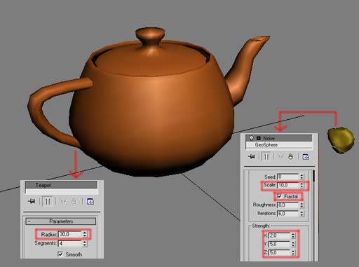 Şimdi arkadaşlar ilk önce bir tane teapot oluşturalım sanhemize ve ebatlarını kafanıza göre belirleyin..Bir tanede geosphere yapın ..Ebadı ise (benimkinden örnek vereyim teapot:30 geosphere:5) olsun..Bunun nedenini pflowda teapotu kaplayacağımız için ufak tercih ettim..Bu geosphere´e noise uygulayın..Benim ayarlar seed:0 scale:10 fractal:on x=2 y=5 z=5 aslında bu ayarların fazla bir önemi yok sadece girintili çıkıntılı olması için yaptım..Benim ayarları baz alarak daha rahat çözebilirsiniz..Ama Siz geneda keyfinize göre yapabilirsiniz ..