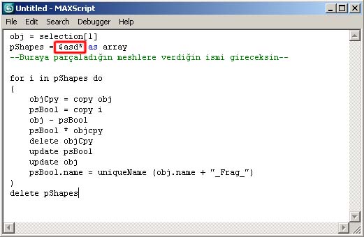 Şu code´un içindeki "asd" bizim editable meshlere verdiğimiz isim olduğundan burada scripte hangi parçaları kullanacağını tanımlıyoruz arkadaşlar..Teapot seçili iken scripte girdiğimiz asd ismi..ekrandaki bütün asd isimli objeleri teapot üzerinde uygula demektir..Burası bu nedenle önemli...yani siz editable mesh ile parçalanmış objeye hangi ismi verirseniz kodun bu kısmına aynı ismi vermeniz gerek...($verdiğin isim* şeklinde olacak)
