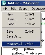 Birde bu scripti çalıştıramayacağınızı düşünerek onuda anlatayım...Scripti new script penceresine yerleştirdiniz ..İsmide değiştirdiniz..çalıştırmak içinde new script penceresinin file butonuna tıklayın evaluate all deyin..Böylece çalışmış olacak.Veya bu scipti masa üzerine notpad dökümanı olarak kaydedin ve maxscript´i açın ve run script´e tıklayıp bu notpad dosyasını seçin böylece çalışmış olacak..