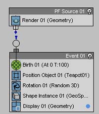-Tepotu kaplamayı istediğimizden pflowa bu maddeyi tanıtmamız gerekiyor..O yüzdende maddeyi tanımlayan position object´i seçip birth´ün altına yerleştirelim..Sonrada teapotu position object´e ekleyin (add veya by list ten)