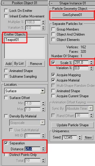 Şimdi daha homojen yerleşmiş olması gerek ama hala boşluklar var..Bu boşluklarıda shape instance kısmına tıklayın.Ve scale ayarları ile oynayarak tamamen kaplayın teapotunuzu..Hiç boşluk görmeyeceksiniz arkadaşlar...Ben scale=291 yapınca tamamen kaplandı benim teapot..