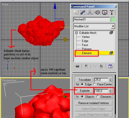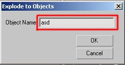 Bu hale geldikten bu şekli hiç bozmadan editable mesh´in alt menülerinde bulunan explode kısmına gelip yandaki değeri 180 yapıp explode´ye tıklıyorsunuz...Açılacak "explode to object" kısmına asd ismini girin ...