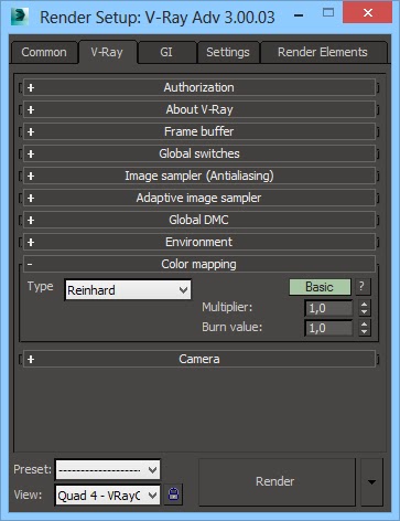 3dsmax ayarları şimdilik bu kadar şimdi vray kısmına bakalım. Vray 3 de ayar seçenekleri basitleştirilmiş olduğundan ilgili menü ilk kurulum haline görünmüyor Render Setup ( F10 kısayolu) kısmında V-Ray bölümünde Color mapping seçeneğinde Mavi renkli "Basic" diye bir seçenek görülür orada Basit yazısının üzerinde farenin sağ tuşuna basıp " Switch All to Expert" i seçin pencere kapanacak ve tekrar gelecektir şimdi gamma ayarlarının ekranda belirdiğini göreceksiniz.