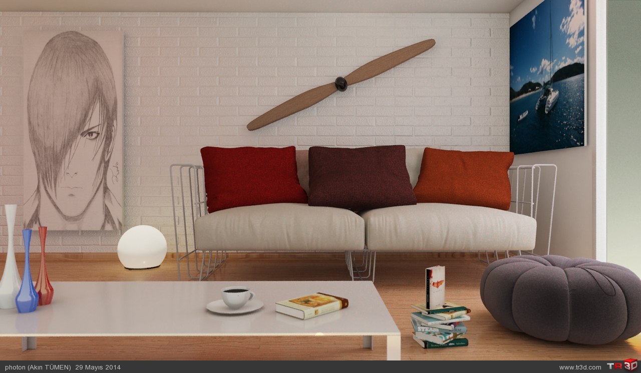 1,5 gün (render) dahil uğraştığım bir sahnedir. Sahnede Hazır modeller var. Photoshop düzeltmesi yoktur. Amaç iç mekanda ışık kullanımı idi.Bazı modelleride kendim modelledim. Ticari değildir. Kolay gelsin herkese..