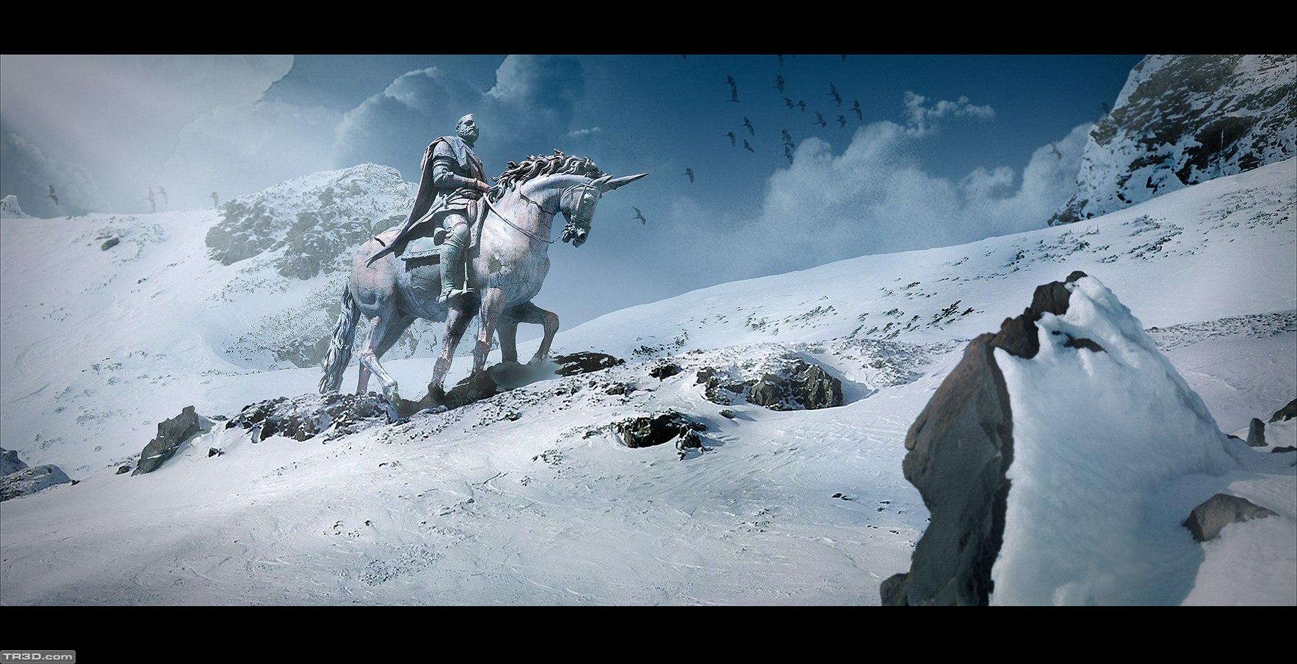 Image Description Matte painting of a forgotten statue up in the cold mountains.